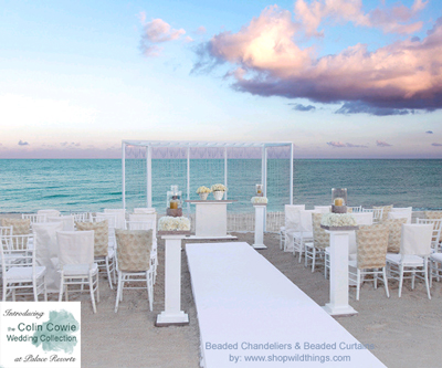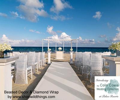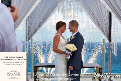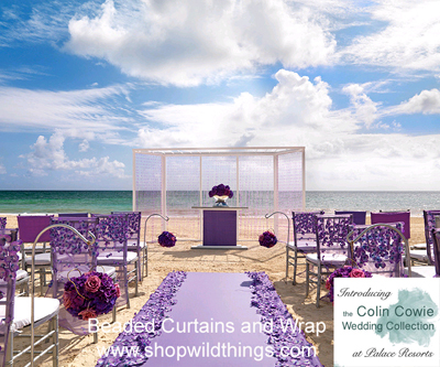 We're tickled to be the premier provider of many wedding and event decor items to Colin Cowie and Palace Resorts! They both buy from us to make their Destination Weddings even more special. Our beaded curtains are a popular item to add to wedding gazebos, as you will see in the spectacular images below. At the very bottom of this page, see the beaded items used to create extra sparkle and shine on the wedding gazebo featured in these photos.
